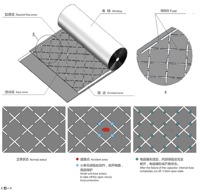 BM電容器中的P0表示不防爆,P2表示防爆。安全膜類電容防爆原理,金屬化電極采用微保險(xiǎn)絲網(wǎng)狀結(jié)構(gòu)(如圖一),在電容運(yùn)行發(fā)生故障時(shí),通過微保險(xiǎn)絲斷開,自動(dòng)切斷電源,從而防止故障擴(kuò)大,達(dá)到自我安全保護(hù)目的